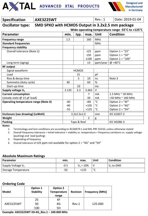 AXTAL晶振,AXE3225WT晶振,AXE3225WT-50-4G_Rev.1-20.000MHz晶振