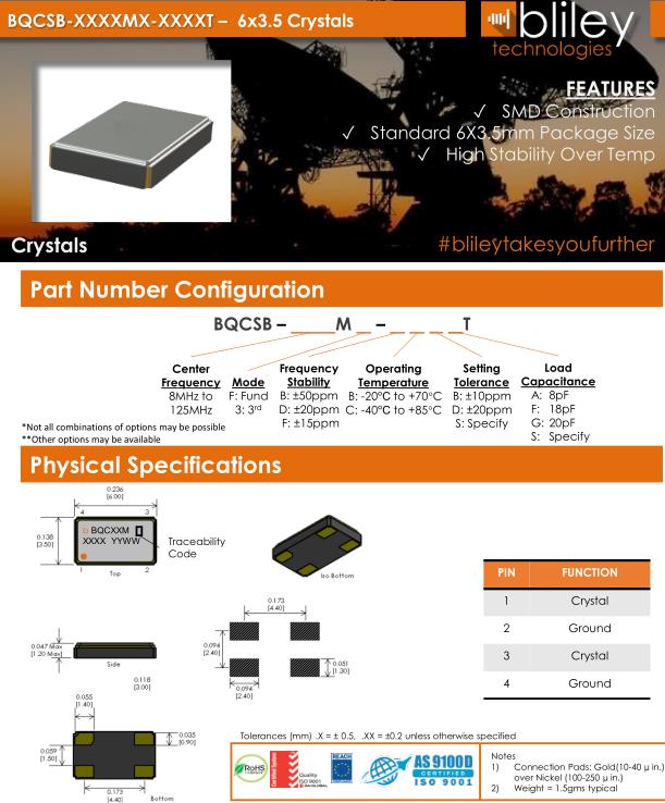 Bliley晶振,BQCSB晶振,BQCSB-16.000M-FFBDAT晶振,貼片晶振本身體積小,超薄型石英晶體振蕩器,特別適用于有目前高速發展的高端電子數碼產品,因為晶振本身小型化需求的市場領域,小型,薄型是對應陶瓷振蕩器(偏差大)和普通的石英晶體振蕩器(偏差小)的中間領域的一種性價比較出色的產品.產品廣泛用于筆記本電腦,無線電話,衛星導航SSD,USB,Blu-ray等用途,符合無鉛焊接的高溫回流焊曲線特性.Bliley晶振公司發展歷史: