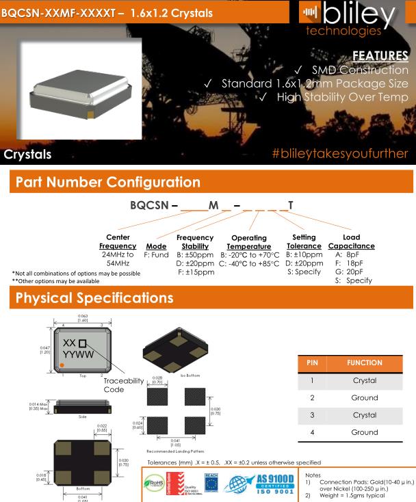 Bliley晶振,BQCSN晶振,BQCSN-24.000M-FFCDST晶振,貼片晶振本身體積小,超薄型石英晶體振蕩器,特別適用于有目前高速發(fā)展的高端電子數(shù)碼產(chǎn)品,因為晶振本身小型化需求的市場領(lǐng)域,小型,薄型是對應(yīng)陶瓷振蕩器(偏差大)和普通的石英晶體振蕩器(偏差小)的中間領(lǐng)域的一種性價比較出色的產(chǎn)品.產(chǎn)品廣泛用于筆記本電腦,無線電話,衛(wèi)星導航SSD,USB,Blu-ray等用途,符合無鉛焊接的高溫回流焊曲線特性.Bliley Technologies Inc. 最初于 1930 年作為 Bliley Piezo-Electric Company 成立。最初,我們?yōu)闃I(yè)余無線電市場制造石英晶體。在 1930 年代中期,我們的客戶和產(chǎn)品很快擴大到與新興的軍事和商業(yè)通信領(lǐng)域的利益相匹配,我們的名稱更名為 Bliley Electric Company。1939 年,我們是最大的水晶公司,擁有 11 名員工。