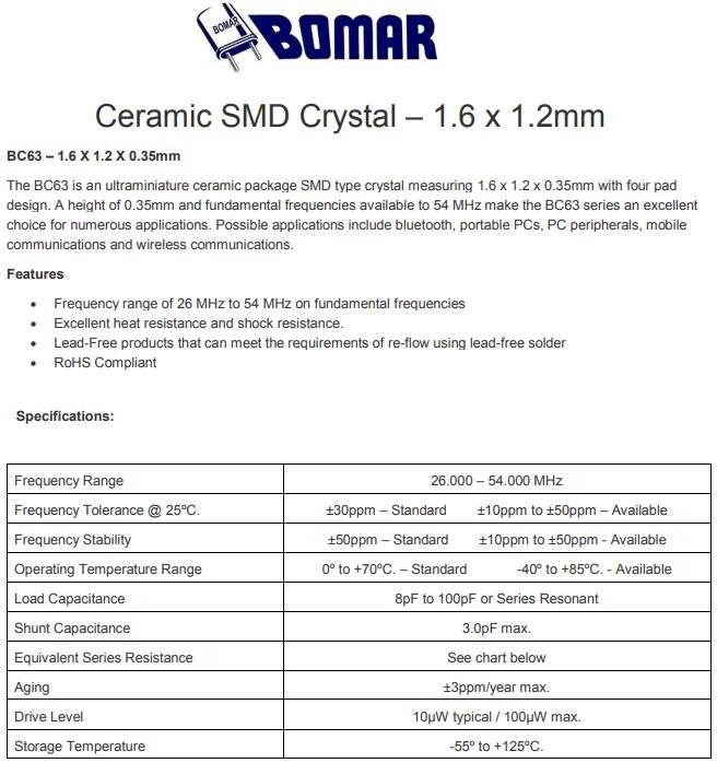 Bomar晶振,BC63晶振,BC63EFD120-30.000000晶振,貼片晶振本身體積小,超薄型石英晶體振蕩器,特別適用于有目前高速發(fā)展的高端電子數(shù)碼產(chǎn)品,因為晶振本身小型化需求的市場領域,小型,薄型是對應陶瓷振蕩器(偏差大)和普通的石英晶體振蕩器(偏差小)的中間領域的一種性價比較出色的產(chǎn)品.產(chǎn)品廣泛用于筆記本電腦,無線電話,衛(wèi)星導航SSD,USB,Blu-ray等用途,符合無鉛焊接的高溫回流焊曲線特性.Bomar成立于 1963 年,是一家為商業(yè)和雙向無線電行業(yè)生產(chǎn)石英晶體的制造商。該業(yè)務的性質(zhì)要求在寬頻率范圍內(nèi)具有嚴格的容差和高穩(wěn)定性晶體,以滿足嚴格的 FCC 規(guī)范。快速生產(chǎn)的需求對我們不斷增長的客戶群很重要。我們的許多客戶都是當?shù)亍⒅莺吐?lián)邦警察和監(jiān)視機構(gòu)。Bomar 很快不僅成為該市場的領先供應商,而且因其產(chǎn)品質(zhì)量、快速周轉(zhuǎn)時間和無與倫比的客戶服務而獲得一致認可。