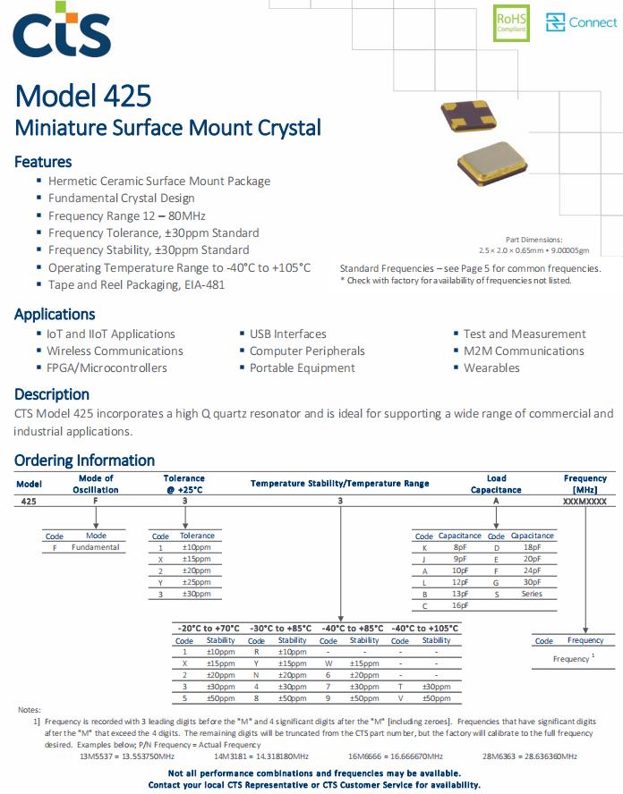| 425F39E040M0000 | CTS晶振 | 425 | MHz Crystal | 40MHz |