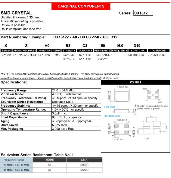 | Cardinal晶振規(guī)格 | 單位 | CX1612晶振頻率范圍 | 石英晶振基本條件 |