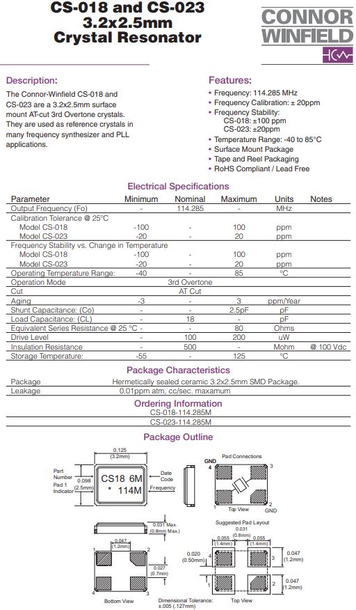 康納溫菲爾德晶振,CS-018晶振,CS-018-114.285M晶振,3225mm體積貼片晶振適用于汽車電子領(lǐng)域的表面貼片型石英晶振,本產(chǎn)品已被確定的高信賴性最適合用于汽車電子部件,晶體在極端嚴(yán)酷的環(huán)境條件下也能發(fā)揮穩(wěn)定的起振特性,晶振本身具有耐熱,耐振,耐沖擊等優(yōu)良的耐環(huán)境特性,滿足無(wú)鉛焊接的高溫回流溫度曲線要求,符合AEC-Q200標(biāo)準(zhǔn).Connor-Winfield Corporation 是一家私人控股的美國(guó)電子產(chǎn)品制造商。1963 年成立后,Connor-Winfield 主要專注于設(shè)計(jì)和制造用于各種電子應(yīng)用的石英計(jì)時(shí)電路和振蕩器。在 1990 年代,Connor-Winfield 擴(kuò)展到其他產(chǎn)品領(lǐng)域,同時(shí)繼續(xù)關(guān)注其核心計(jì)時(shí)根源。