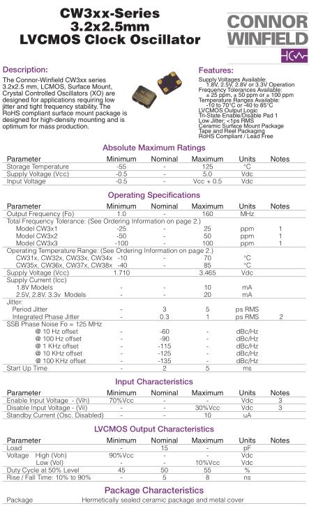 康納溫菲爾德晶振,CW34晶振,CW333-024.000M晶振,小型SMD有源晶振,從最初超大體積到現在的7050mm,6035mm,5032mm,3225mm,2520mm體積,有著翻天覆地的改變,體積的變小也使產品帶來了更高的穩定性能,接縫密封石英晶體振蕩器,精度高,覆蓋頻率范圍寬的特點,SMD高速自動安裝和高溫回流焊設計,Optionable待機輸出三態輸出功能,電源電壓范圍:1.8V~5V,高穩定性,低抖動,低功耗,主要應用領域:無線通訊,高端智能手機,平板筆記本WLAN,藍牙,數碼相機,DSL和其他IT產品的晶振應用,三態功能,PC和LCDM等高端數碼領域,符合RoHS/無鉛.