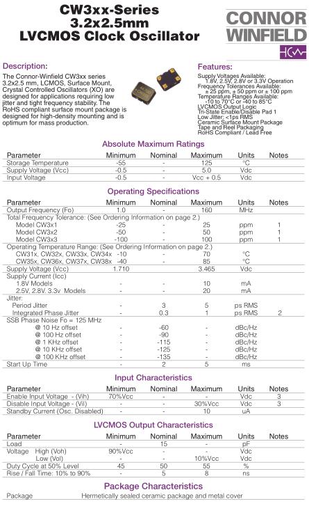 ConnorWinfield晶振,CW37晶振,CW333-020.0M晶振,小型SMD有源晶振,從最初超大體積到現在的7050mm,6035mm,5032mm,3225mm,2520mm體積,有著翻天覆地的改變,體積的變小也使產品帶來了更高的穩定性能,接縫密封石英晶體振蕩器,精度高,覆蓋頻率范圍寬的特點,SMD高速自動安裝和高溫回流焊設計,Optionable待機輸出三態輸出功能,電源電壓范圍:1.8V~5V,高穩定性,低抖動,低功耗,主要應用領域:無線通訊,高端智能手機,平板筆記本WLAN,藍牙,數碼相機,DSL和其他IT產品的晶振應用,三態功能,PC和LCDM等高端數碼領域,符合RoHS/無鉛.