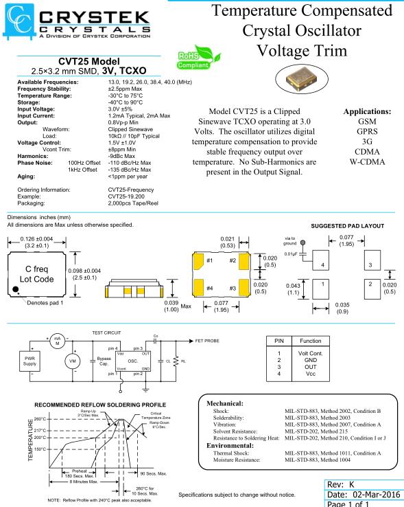 Crystek晶振,CVT25晶振,CVT25-19.200晶振,溫補晶振(TCXO)產品本身具有溫度補償作用,高低溫度穩(wěn)定性:頻率精度高0.5PPM-2.0PPM,工作溫度范圍:-30度至85度,電源電壓:1.8V-3.3V之間可供選擇,產品本身具有溫度電壓控制功能,世界上最薄的晶振封裝,頻率:26兆赫,33.6兆赫,38.4兆赫,40兆赫,因產品性能穩(wěn)定,精度高等優(yōu)勢,被廣泛應用到一些比較高端的數碼通訊產品領域,GPS全球定位系統(tǒng),智能手機,WiMAX和蜂窩和無線通信等產品,符合RoHS/無鉛.