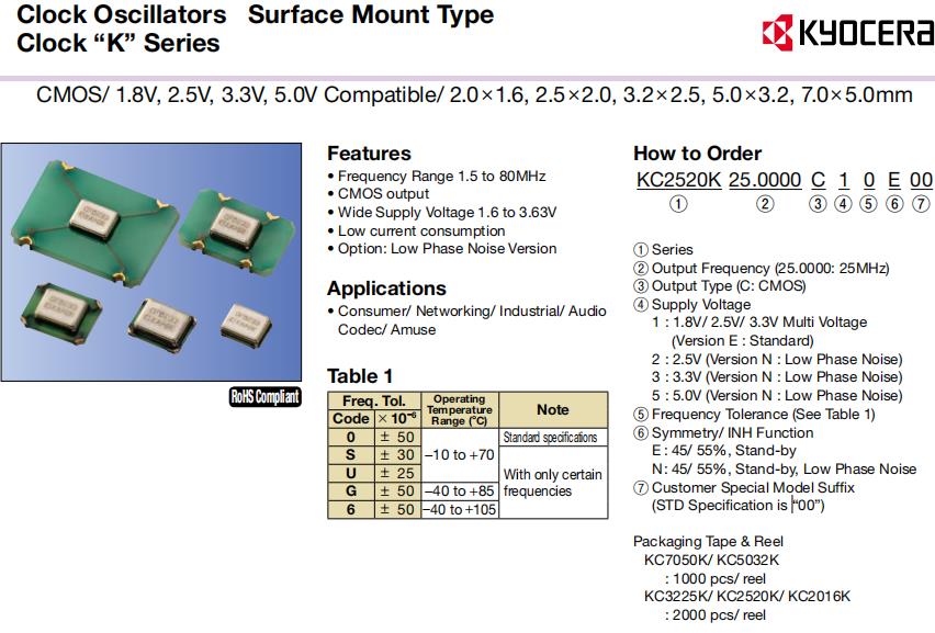 | KC2520K80.0000C1GE00 | Kyocera有源振蕩器 | KC2520K, Kyocera | 80MHz | 1.6 V ~ 3.63 V | -40°C ~ 85°C |