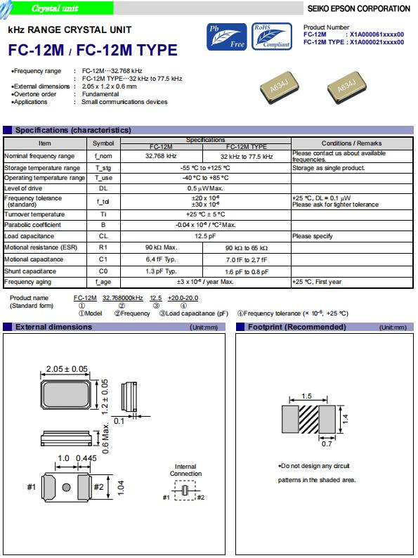 | X1A000061001400 | 2.05 x 1.2 x 0.6 mm | FC-12M | 32.768kHz | 12.5 pF | +/-10.0 ppm | -40 to +85 °C |