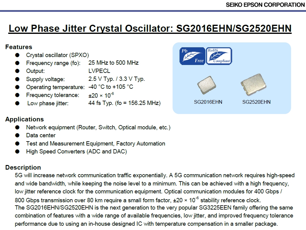| X1G0058810005 | 愛普生晶振 | SG2520EGN | 156.250000 MHz | 2.50 x 2.00 x 0.84 mm | LV-PECL | 3.135 to 3.465 V | -40 to 105 °C |