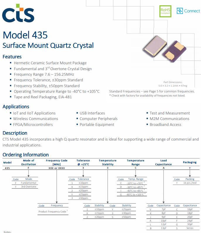 CTS 435型集成了高Q石英晶體諧振器,是支持廣泛的商業和工業應用。