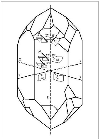 晶片的切割可分為AT-CUT, BT-CUT, CT-CUT, DT-CUT, FT-CUT, XT-CUT, YT-CUT,如圖所示.它是以光軸(Z軸)為參考而命名,每種切法對應一個角度.采用何種切法應根據實際情況而定,如對溫度特性要求較好則應采用AT-CUT,如果對晶振要求的頻率較高時則采用BT-CUT.晶片的切割方式、幾何形狀、尺寸等決定了貼片晶振的頻率.(你知道嗎?)