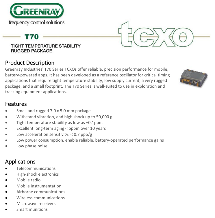 Greenray美國格林雷T70系列TCXO晶振移動應(yīng)用的精準(zhǔn)之芯