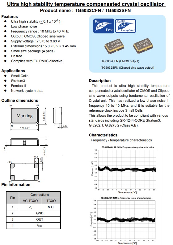 日本進口愛普生晶振TG5032CFN,溫補晶體振蕩器(TCXO),超高穩定性(< 0.1 x 10-6) ,頻率范圍:10MHz至40MHz,CMOS輸出,限幅正弦波,電源電壓:2.375至3.63V,小體積晶振尺寸5.0x3.2x1.45mm,小型包裝(4個襯墊腳) ,具有低相位噪聲,低抖動晶振,低耗能,低功耗,低損耗等特點,無鉛,符合歐盟RoHS指令。該產品具有超高的穩定溫度CMOS和限幅補償晶體振蕩器,使用基波振蕩的正弦波輸出 水晶單位。這實現了低相位噪聲頻率10至40MHz,適用于參考時鐘包括小單元。 這使得該產品符合各種標準包括GR-1244-CORE Stratum3、 G.8262.1,G.8273.2(甲、乙類)。