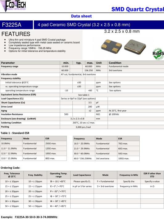 FCD-Tech晶振,F3225A晶振,F3225A-3050D303-24.000MHz晶振,超小型表面貼片型SMD晶振,最適合使用在汽車(chē)電子領(lǐng)域中,也是特別要求高可靠性的引擎控制用CPU的時(shí)鐘部分.低頻晶振可從7.98MHz起對(duì)應(yīng),小型,超薄型具備強(qiáng)防焊裂性,石英晶體在極端嚴(yán)酷的環(huán)境條件下也能發(fā)揮穩(wěn)定的起振特性,產(chǎn)品本身具有耐熱,耐振,耐撞擊等優(yōu)良的耐環(huán)境特性,滿足無(wú)鉛焊接以及高溫回流溫度曲線要求,符合AEC-Q200標(biāo)準(zhǔn).