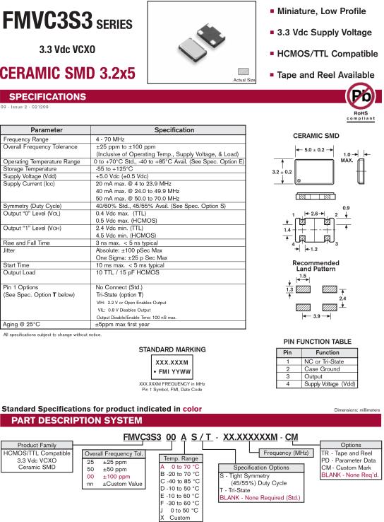 FMI晶振,FMVC3S3晶振,FMVC3S300AS/-24.000M-CM晶振,壓控晶振(VCXO),壓控石英晶體振蕩器基本解決方案,PECL輸出,輸出頻率60MHz到200MHz之間,出色的低相位噪聲和抖動,三態功能,應用:SDH/SONET,以太網,基站,筆記本晶振應用,符合RoHS/無鉛.FMI晶振作為標準通信公司的專屬供應商,我們成立于1971年,30多年來,我們一直為通信市場提供快速交付和嚴格公差,石英晶體和晶體振蕩器.1992年,頻率管理已擴展到OEM市場. FMI,頻率管理國際,成立的目的是為各種行業的各種電子系統應用提供頻率和時序控制的工程解決方案.FMI是一家真正以解決方案為導向的美國制造商.我們目前為各種細分市場提供產品,包括:極端環境,能源勘探,石油和天然氣勘探(各種定向鉆井工具),石油和天然氣生產工具,地熱/,熱監測工具,空間,科學(低地球軌道),科學(深空),廣告,軍事和航空航天,航空電子學,導航,控制系統,商業和工業,電信(有線或無線),無線(包括實用計量和大容量微型調制解調器,如XBee),工業控制(包括計量),汽車(發動機傳感器等),電腦周邊設備,LAN/WAN,光網絡.