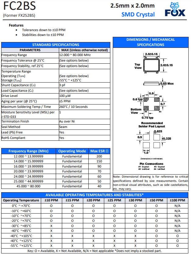 FX252BS-20.000晶振 參數(shù)表| FOX晶振規(guī)格 | 單位 | FX252B晶振頻率范圍 | 石英晶振基本條件 |