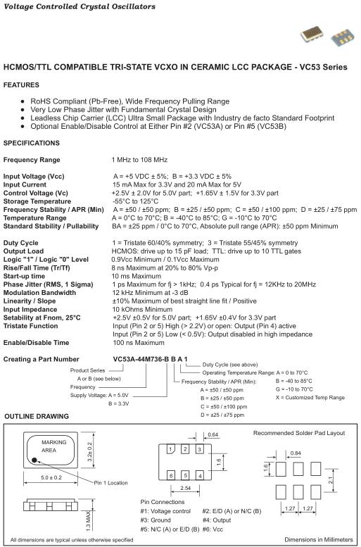 Fortiming晶振,VC53晶振,VC53A-12M736-BBA1晶振,VCXO壓控晶振,壓控石英晶體振蕩器基本解決方案,PECL輸出,輸出頻率60MHz到200MHz之間,出色的低相位噪聲和抖動,三態功能,應用:SDH/SONET,以太網,基站,筆記本晶振應用,符合RoHS/無鉛.我們致力于為您提供最好的服務,這是我們知道的最佳方式,可以贏得您的信任并建立持久的關系.收集和組織有關頻率控制和時序管理應用相關主題的最新信息,它涵蓋了型產品開發,新應用,型制造技術以及全球最新業務開發.