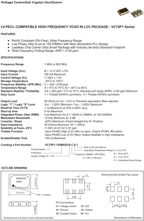 Fortiming晶振,VC75P1晶振,VC75P1-26M520-BCA1晶振,壓控晶振(VCXO),壓控石英晶體振蕩器基本解決方案,PECL輸出,輸出頻率60MHz到200MHz之間,出色的低相位噪聲和抖動,三態功能,應用:SDH/SONET,以太網,基站,筆記本晶振應用,符合RoHS/無鉛.
