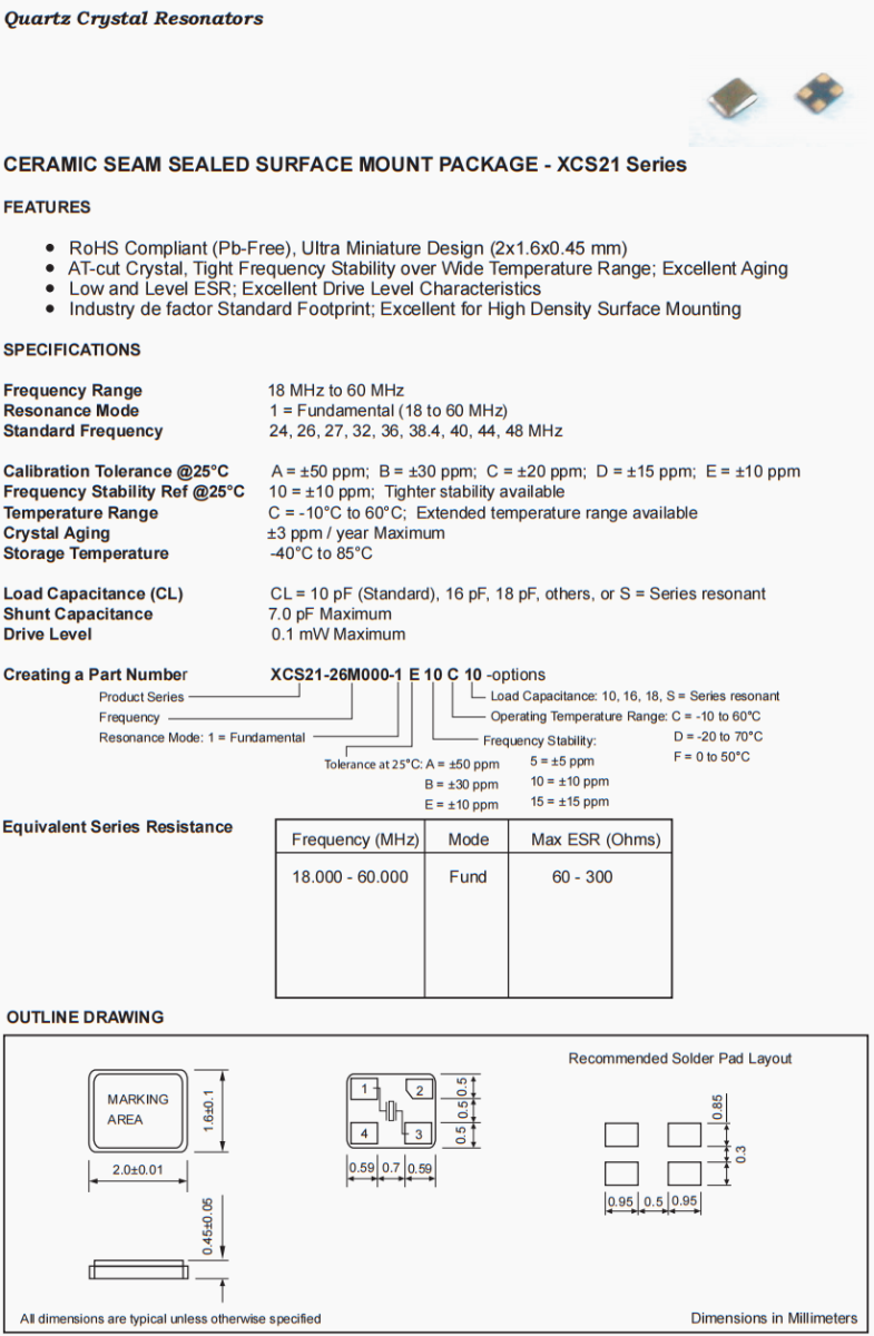 Fortiming高品質晶振,XCS21-19M020-1E10C10環保晶振,工業機器人晶振,美國Fortiming晶振公司,富通晶振,SMD晶振,超小型晶振,2016晶振,北斗導航模塊晶振,醫療設備晶振,低損耗晶振,四腳晶振,低成本晶振,環保無鉛晶振,高穩定性晶振,石英晶振,貼片晶振,6G網絡終端晶振,無源晶振,陶瓷SEAM密封表面貼裝封裝- XCS21系列,特點,符合RoHS標準(無鉛),超小型設計(2x1.6x0.45 mm), at切割晶體,寬溫度范圍內緊密的頻率穩定性;優異的老化性能,低水平的ESR;卓越的驅動級特性,行業標準的足跡;非常適合高密度表面安裝