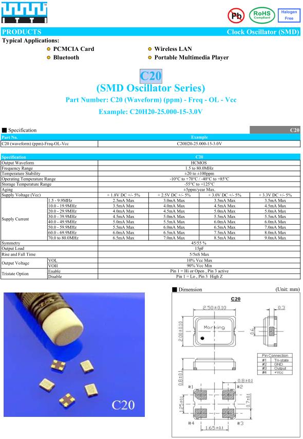 ITTI晶振,C20晶振,C20H20-25.000-15-3.0V晶振,小型SMD有源晶振,從最初超大體積到現在的7050mm,6035mm,5032mm,3225mm,2520mm體積,有著翻天覆地的改變,體積的變小也使產品帶來了更高的穩定性能,接縫密封石英晶體振蕩器,精度高,覆蓋頻率范圍寬的特點,SMD高速自動安裝和高溫回流焊設計,Optionable待機輸出三態輸出功能,電源電壓范圍:1.8V~5V,高穩定性,低抖動,低功耗,主要應用領域:無線通訊,高端智能手機,平板筆記本WLAN,藍牙,數碼相機,DSL和其他IT產品的晶振應用,三態功能,PC和LCDM等高端數碼領域,符合RoHS/無鉛.TTI抱著簡單而創新的宗旨,為各客戶提供優質,經濟的石英電子,更希望成為各位客戶之長遠合作伙伴; 擁有全面,先進之石英晶體,包括, 晶體濾波器(Crystal Filter)、陶瓷諧振器(Ceramic Resonator) 與及其他最先進之晶體振蕩器(Crystal Oscillator)…。等產品。我們擁有可媲美世界一級水平之能力及資源。