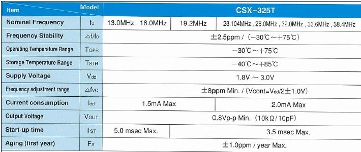 具有最適合于移動通信設備用途的高穩定的頻率溫度特性。為對應低電源電壓的產品。(可對應DC +1.8 V±0.1 V to +3.2 V±0.1 V )高度:最高1.0 mm、體積:0.007 cm3、重量:0.024g,超小型、輕型。低消耗電流、表...