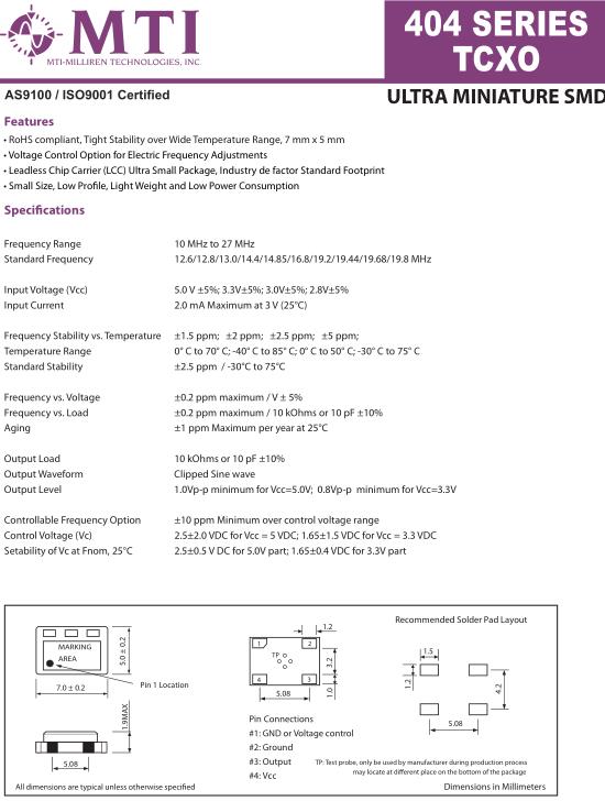 MTI晶振,404晶振,TCXO振蕩器,溫補晶振(TCXO)產品本身具有溫度補償作用,高低溫度穩(wěn)定性:頻率精度高0.5PPM-2.0PPM,工作溫度范圍:-30度至85度,電源電壓:1.8V~3.3V之間可供選擇,產品本身具有溫度電壓控制功能,世界上最薄的晶振封裝,頻率:26兆赫,33.6兆赫,38.4兆赫,40兆赫,因產品性能穩(wěn)定,精度高等優(yōu)勢,被廣泛應用到一些比較高端的數碼通訊產品領域,GPS全球定位系統(tǒng),智能手機,WiMAX和蜂窩和無線通信等產品,符合RoHS/無鉛.