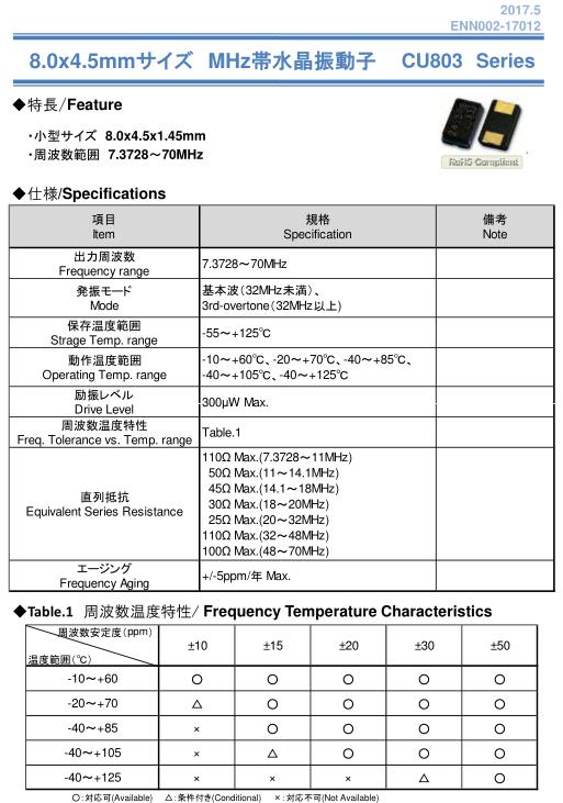NAKA晶振,CU803晶振,水晶振動子,貼片石英晶振最適合用于車載電子領(lǐng)域的小型表面貼片石英晶體振蕩器.也可對應(yīng)有高可靠性要求的引擎控制用CPU的時鐘部分簡稱為時鐘晶體振蕩器,在極端嚴酷的環(huán)境條件下也能發(fā)揮穩(wěn)定的起振特性,產(chǎn)品本身具有耐熱,耐振,耐撞擊等優(yōu)良的耐環(huán)境特性,滿足無鉛焊接的回流溫度曲線要求,符合AEC-Q200標準.作為一名優(yōu)秀的企業(yè)公民,Naka&Co.,Ltd。的目標是成為“對地球友好的公司”,致力于環(huán)境保護并繼續(xù)開展以下活動。