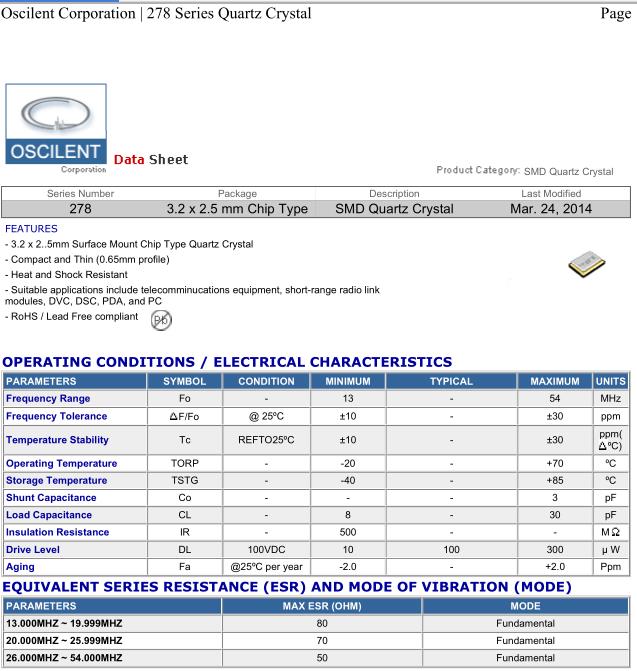 Oscilent晶振,278晶振,278-25.0M-20-W-TR晶振