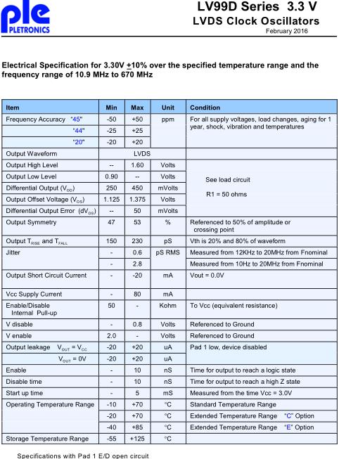 Pletronics晶振,LV99D晶振,LVDS輸出晶振