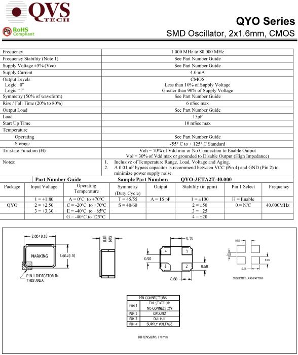 QVS晶振,QYO晶振,QYO-3ETA2T-24.000晶振,小型SMD有源晶振,從最初超大體積到現在的7050mm,6035mm,5032mm,3225mm,2520mm體積,有著翻天覆地的改變,體積的變小也使產品帶來了更高的穩定性能,接縫密封石英晶體振蕩器,精度高,覆蓋頻率范圍寬的特點,SMD高速自動安裝和高溫回流焊設計,Optionable待機輸出三態輸出功能,電源電壓范圍:1.8V~5V,高穩定性,低抖動,低功耗,主要應用領域:無線通訊,高端智能手機,平板筆記本WLAN,藍牙,數碼相機,DSL和其他IT產品的晶振應用,三態功能,PC和LCDM等高端數碼領域,符合RoHS/無鉛.QVS晶振提供標準頻率和自定義頻率的各種石英晶體、時鐘振蕩器、VCXO、TCXO和OCXO。這使我們能夠為包括電信、測試和儀器儀表、醫療和航空航天在內的廣泛應用和市場提供頻率控制解決方案.