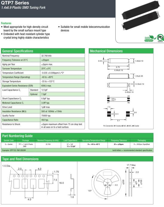 QANTEK晶振,QTP7晶振,QTP732.76812B20R晶振,貼片表晶32.768K系列具有超小型,薄型,質地輕的表面貼片音叉型石英晶體振蕩器,晶振產品本身具備優良的耐熱性,耐環境特性,在辦公自動化,家電領域,移動通信領域可發揮優良的電氣特性,符合無鉛標準,滿足無鉛焊接的回流溫度曲線要求,金屬外殼的石英晶振使得產品在封裝時能發揮比陶瓷晶振外殼更好的耐沖擊性能.