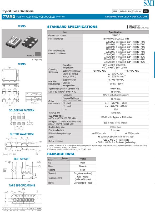 77SMO(A): ±100 ppm over -20゜C to +70゜C 77SMO(B): ±50 ppm over -20゜C to +70゜C 77SMO(C): ±30 ppm over -20゜C to +70゜C 77SMO(D): ±25 ppm over -20゜C to +70゜C 77SMO(E): ±20 ppm over -20゜C to +70゜C 77SMO(AW): ±100 ppm over -40゜C to +85゜C 77SMO(BW): ±50 ppm over -40゜C to +85゜C 77SMO(CW): ±30 ppm over -40゜C to +85゜C 77SMO(DW): ±25 ppm over -40゜C to +85゜C |