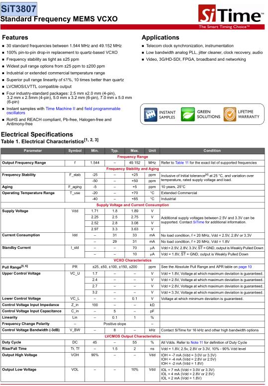 SiTime晶振,SiT3807晶振,SiT3807AC-G2-33EH-24.000000D晶振,有源晶振,是指晶體本身起振需要外部電壓供應,起振后可直接驅動CMOS集成電路,產品本身已實現與薄型IC(TSSOP封裝,TVSOP封裝)同樣的1mm厚度,斷開時的消費電流是15µA以下,編帶包裝方式可對應自動搭載及IR回流焊接(無鉛對應)產品有幾種電壓供選1.8V,2.5V,3V3.3V,5V,以應對不同IC產品需要.SiTime Crystal是MegaChips公司的獨立子公司,主要以生產高精度石英晶體振蕩器,可編程晶體振蕩器,MEMS晶振等器件為主.SiTime晶振主要以生產MEMS晶振,VCXO晶振等頻率元件.
