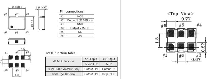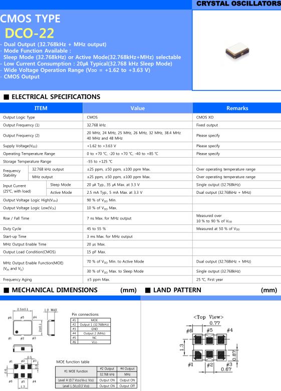 | Active Mode | 2.5 mA Typ., 5 mA Max. at 3.3 V | Dual output (32.768kHz + MHz) | |