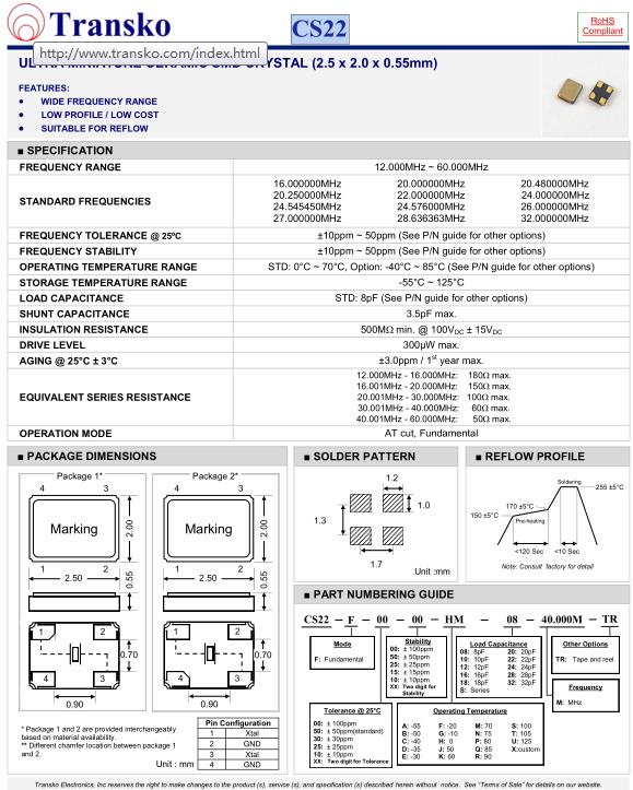 | SPECIFICATION-Transko晶振 | CS22晶振 |
