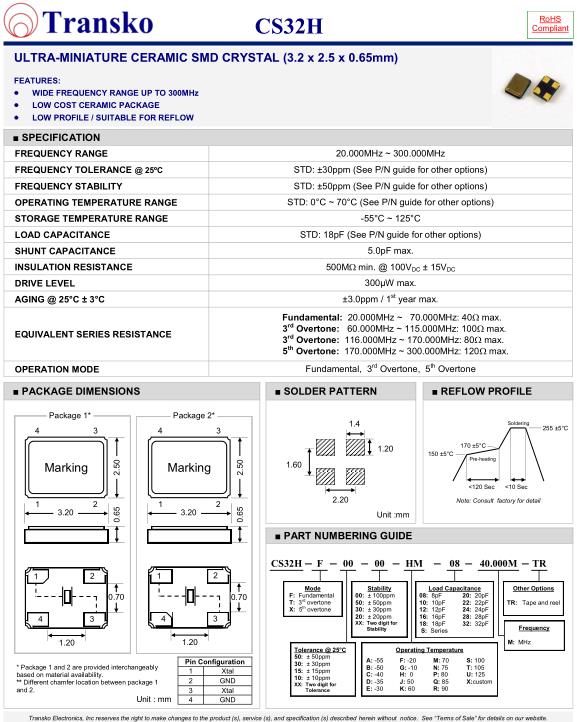 | SPECIFICATION-Transko晶振 | CS32H晶振 |
