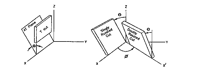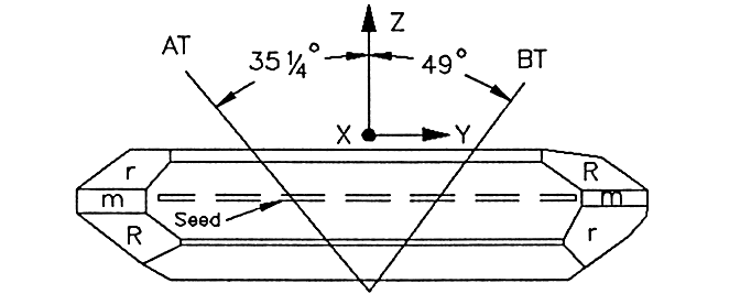 以上是用于制造at切割諧振器的由y取向種子晶體生長的培養石英晶體的示意圖。種子晶體建立了最初的晶體取向,并以犧牲z軸為代價促進了Y方向的生長。晶種是經過精心挑選的,以避免在晶體生長過程中可能產生的缺陷。表明了晶種的位置。從x軸向左傾斜的線表示AT板的鋸切位置,向右傾斜的線表示bt切割。在實踐中,這些角度是非常關鍵的,并使用布拉格x射線衍射精確確定。